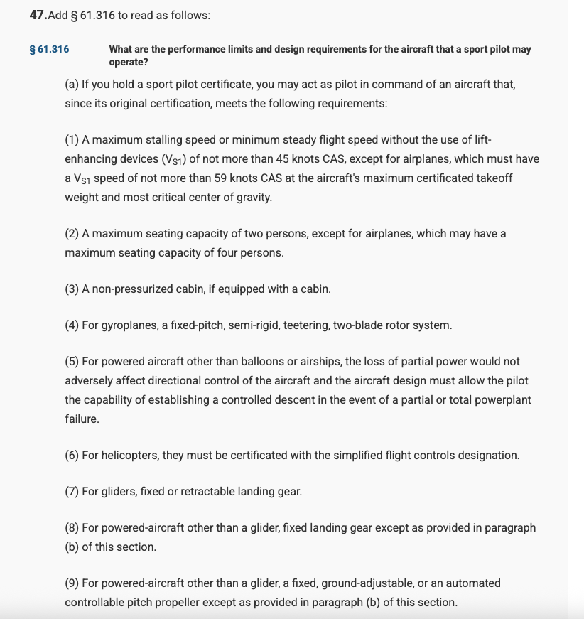 MOSAIC Final Rule: July 18, 2025 - signed July 22, 2025 - announced July 24, 2025 - publication date The published final rule: https://www.federalregister.gov/d/2025-13972 MOSAIC comment links: Note: comment period closed January 2, 2024 but submitted comments can be viewed here: https://www.federalregister.gov/documents/2023/07/24/2023-14425/modernization-of-special-airworthiness-certification An alternate location to comment (Only use one): https://www.regulations.gov/commenton/FAA-2023-1377-0001 You may also send your comment(s) to the EAA here: mosaic@eaa.org (This does NOT go to the FAA.) Our MOSAIC meeting presentation slideshow in pdf is ![]() here Other MOSAIC links: The Federal Register document (fine print, 90 pages long) This is actually the easiest format to read the proposed regulations (near the end on pdf page 74): https://www.govinfo.gov/content/pkg/FR-2023-07-24/pdf/2023-14425.pdf Reference to the 54 K limit in the proposed FARs in the above document: § 22.100(a)(3) (page 78) and § 61.316(a)(1) (page 84) List of vintage aircraft that currently fall under LSA rules: https://flysportusa.com/lsa3.php An unofficial website that explains various medical requirements: https://gofly.sportaviationcenter.com/airplane-pilot-cfi/medical-requirements-airplane-pilot/ LSA information and suggestions on how to comment: https://bydanjohnson.com/ LSA information and suggestions on how to comment: https://www.sportaviationspecialties.com/Useful_Information.htm Videos on MOSAIC AOPA - Dave Hirshman https://www.youtube.com/watch?v=ET4i_iipSAQ Other videos https://www.youtube.com/watch?v=jowb0V1FMgg https://www.youtube.com/watch?v=9zf4-zQcPfg https://www.youtube.com/watch?v=2RXjRM_R0vU FAA links: Current Federal Aviation Regulations: https://www.ecfr.gov/current/title-14/chapter-I "The 59 Knot Rule" Effective October 22, 2025 many, if not most single-engine light aircraft fall under what I will call "The 59 Knot Rule". This new regulation specifies "What are the performance limits and design requirements for the aircraft that a sport pilot may operate?" This allows pilots with a Sport Pilot certificate or above to operate airplanes with a Vs1 of 59 Knots or less under Sport Pilot Rules, which only requires a driver's license as a medical. As of Nov. 11, 2025 FAR 61.316 did not yet appear in the official FAR listing, but below is where it will be: https://www.ecfr.gov/current/title-14/chapter-I/subchapter-D/part-61/subpart-J/section-61.316 For now, here is an image of an excerpt from the Final Rule from The Federal Register listing some of what 61.316 will say: Text of FAR 61.316 (from The Federal Register) LSAs - Light Sport Aircraft The FAA's List of vintage aircraft that currently fall under LSA rules: https://www.faa.gov/sites/faa.gov/files/aircraft/gen_av/light_sport/ExistingModels.pdf CFR - LSA Airworthiness Certification - CFR § 21.190: https://www.ecfr.gov/current/title-14/chapter-I/subchapter-C/part-21/subpart-H/section-21.190 Medical CFR - Medical Certificates - CFR § 61.23: https://www.ecfr.gov/current/title-14/chapter-I/subchapter-D/part-61/subpart-A/section-61.23 CFR - The rule that allows flying with only a driver's license to: Exercise the privileges of a Sport Pilot in a Light-Sport Aircraft - CFR § 61.23(c)(1)(ii): https://www.ecfr.gov/current/title-14/chapter-I/subchapter-D/part-61/subpart-A/section-61.23 CFR - Private Pilots flying under Basic Med - see paragraph i - CFR § 61.113(i): https://www.ecfr.gov/current/title-14/chapter-I/subchapter-D/part-61/subpart-E/section-61.113 CFR - Basic Med - CFR Part 68: https://www.ecfr.gov/current/title-14/chapter-I/subchapter-D/part-68?toc=1 Sport Pilots CFR - Sport Pilots - CFR Part 61 Subpart J: https://www.ecfr.gov/current/title-14/chapter-I/subchapter-D/part-61/subpart-J?toc=1 CFR - Flying as a Sport Pilot / Flying an LSA - CFR § 61.303: Includes rules for flying with only a driver's license See § 61.303(a)(2)(ii)(A)(1) for a private pilot ("At least a recreational pilot...") flying under this rule https://www.ecfr.gov/current/title-14/chapter-I/subchapter-D/part-61/subpart-J/section-61.303 CFR - Sport Pilot Limitations - CFR § 61.315: https://www.ecfr.gov/current/title-14/chapter-I/subchapter-D/part-61/subpart-J/section-61.315 CFR - Sport Pilot Instructors - CFR Part 61 Subpart K: https://www.ecfr.gov/current/title-14/chapter-I/subchapter-D/part-61/subpart-K?toc=1 Sport Pilot Training links Sport Pilot Airplane and Flight Instructor Practical Test Standards 2014 This is for both the Sport Pilot and Sport Pilot Instructor: Free pdf from FAA https://www.faa.gov/sites/faa.gov/files/training_testing/testing/test_standards/faa-s-8081-29.pdf Paper book: https://www.amazon.com/Sport-Pilot-Gyroplane-Instructor-FAA-S-8081-29/dp/B09MJBQSKP/ Sport Pilot Airplane (SPA) Airman Knowledge Test Prep Free pdf from FAA (only 10 pages) https://www.faa.gov/sites/faa.gov/files/training_testing/testing/test_questions/spa_questions.pdf Paper book published by the FAA (no answers) (50 pages) https://www.amazon.com/Sport-Pilot-Airplane-SPA-Knowledge/dp/B09MYQ92WJ/ Rick's CFI page (with links to documents near the bottom) http://rickhenry.com/cfi.html Comments submitted NPRM Comment by Rick Updated November 11, 2025 Return to EAA 42 Home page |